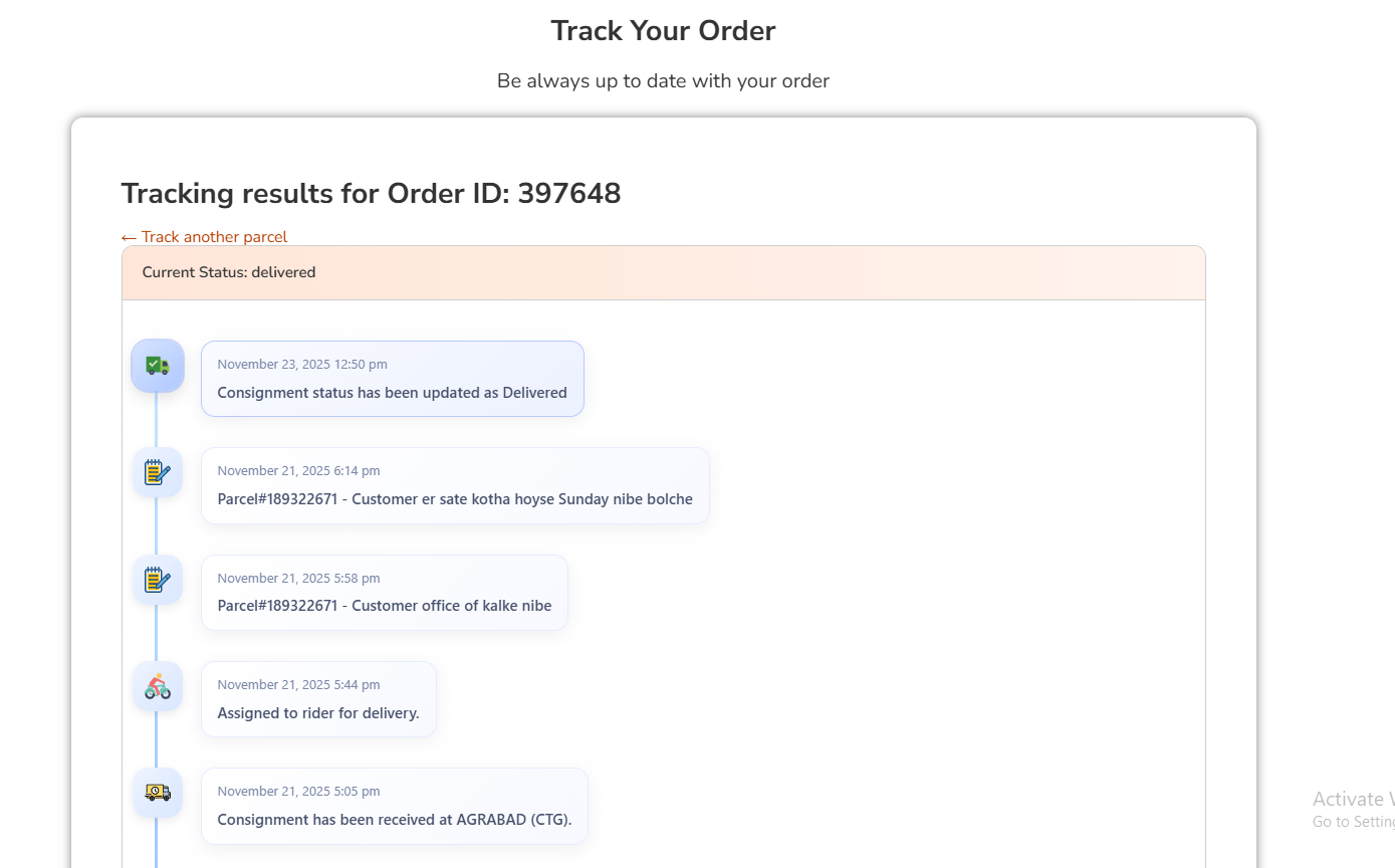- Customer-Facing Tracking Page – Add [steadfast_order_tracking] shortcode to any page